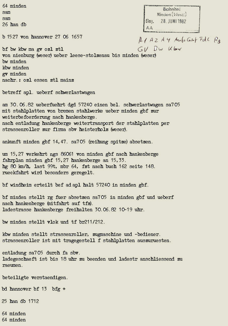 Schließlich musste die Sonderüberführung noch "eingelegt" werden. Wegen des immensen Zeitdrucks erfolgte die Einlegung fernschriftlich. Dieses Fernschreiben hatte es "in sich", schauen wir mal, was wem wie mitzuteilen war, ein paar Punkte, die da wären: